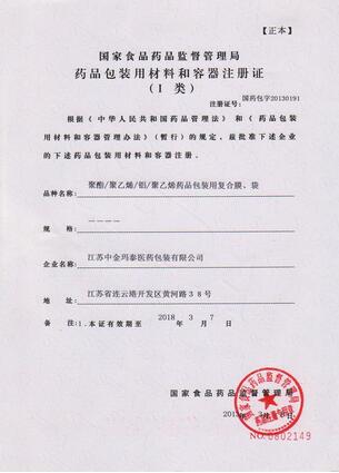 聚乙烯藥品包裝用復合膜、袋”獲得國家食品藥品監督管理局頒發的注冊證書,注冊證號“國藥包字