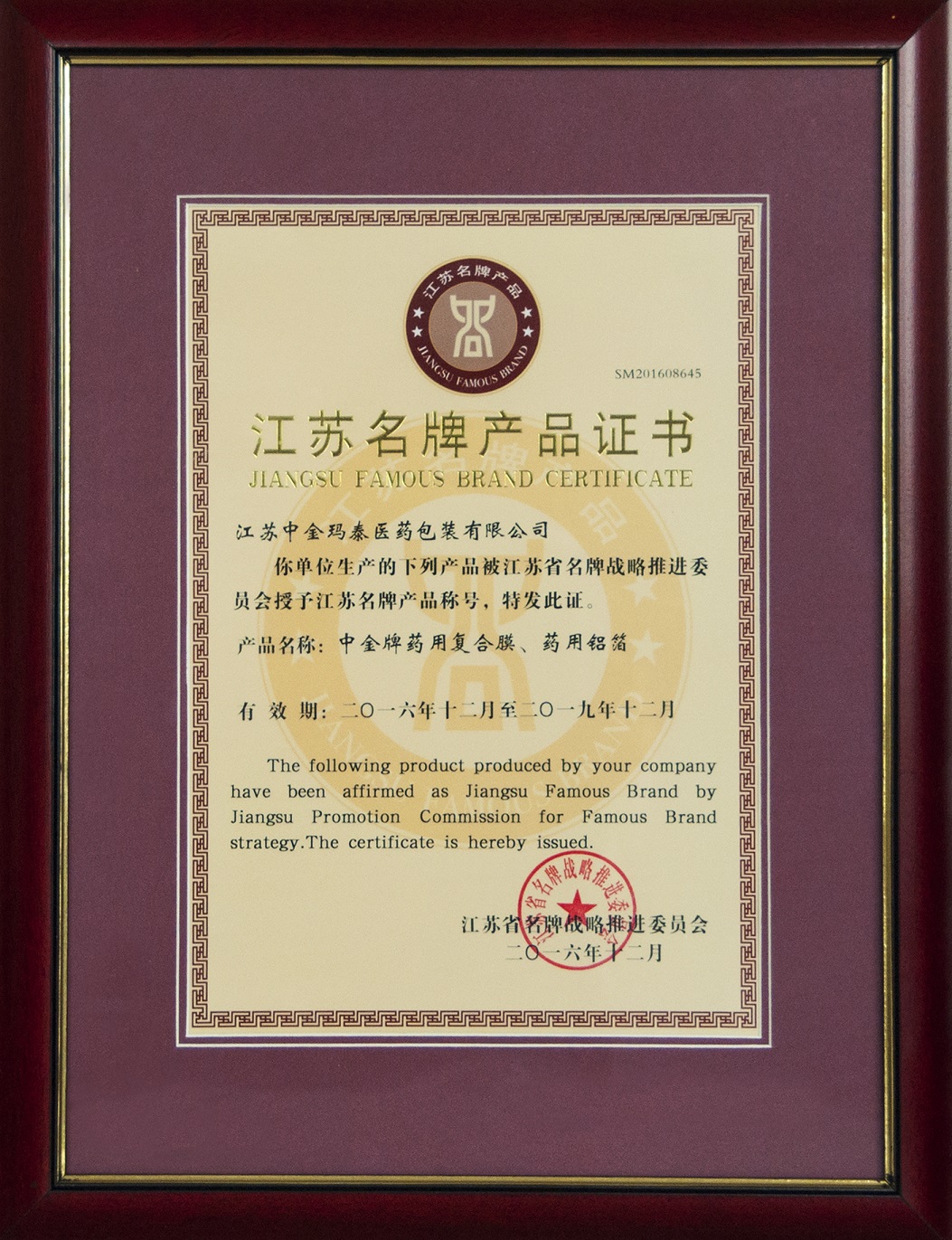 近日,在江蘇省名牌戰(zhàn)略推進委員會公布的2016年度江蘇名牌產(chǎn)品名單中,我公司兩大主營產(chǎn)品,中金牌藥用復合膜、藥用鋁箔榮獲江蘇省名牌產(chǎn)品稱號。