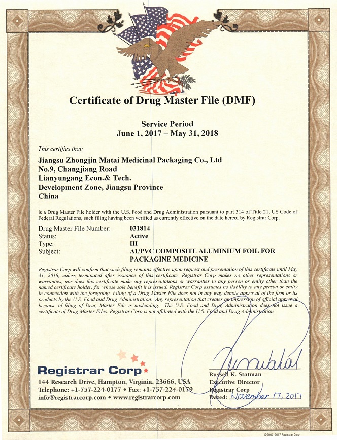 早在2006年開始,中金瑪泰就已著手研發(fā)具有兒童保護(hù)功能的藥品包裝材料,十多年來,經(jīng)過公司技術(shù)研發(fā)人員的不懈努力,對(duì)產(chǎn)品原理、原料、工藝、安全性、保護(hù)性、功能性、相容性等進(jìn)行了深入的研究,推出多種結(jié)構(gòu)的產(chǎn)品,并取得專利一項(xiàng)。今年,其中一款結(jié)構(gòu)為AL/PVC藥用復(fù)合鋁箔獲得客戶青睞,接到歐盟產(chǎn)品訂單,并由研發(fā)人員自行編制技術(shù)資料,申報(bào)美國DMF備案,2017年11月17日通過審核,獲得美國FDA頒發(fā)的DMF備案號(hào)031814。