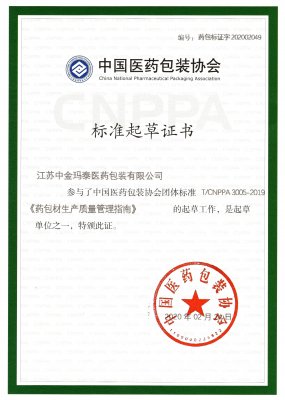 中國醫藥包裝協會團體標準《藥包材生產質量管理指南》(T/CNPPA 3005-2019)于2019年5月8日發布,自2019年5月8日起實施。